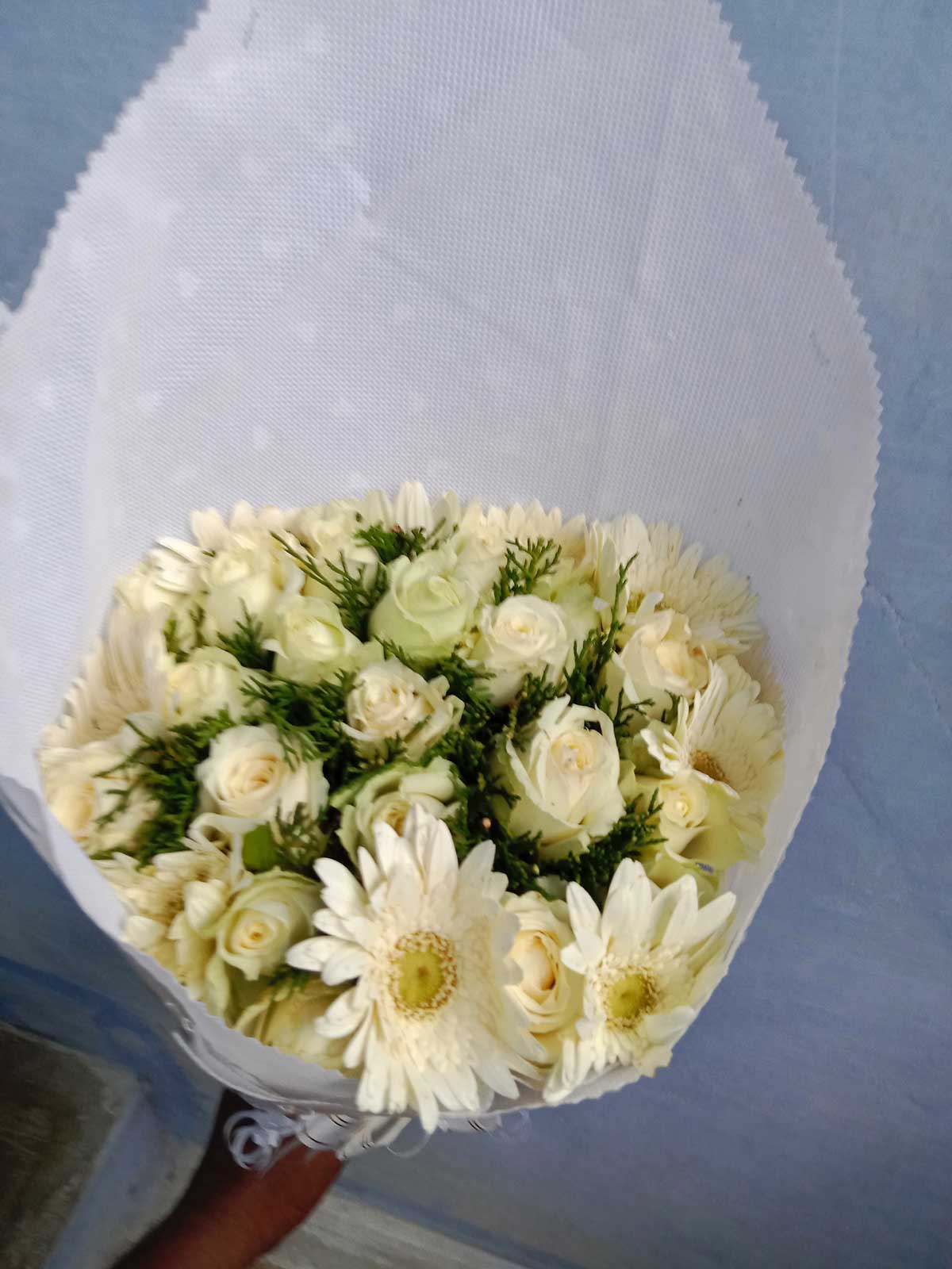 Share your sincere emotions with this elegant Pure White Gerbera & Roses Hand Bouquet, beautifully crafted using fresh white gerbera daisies and premium roses.