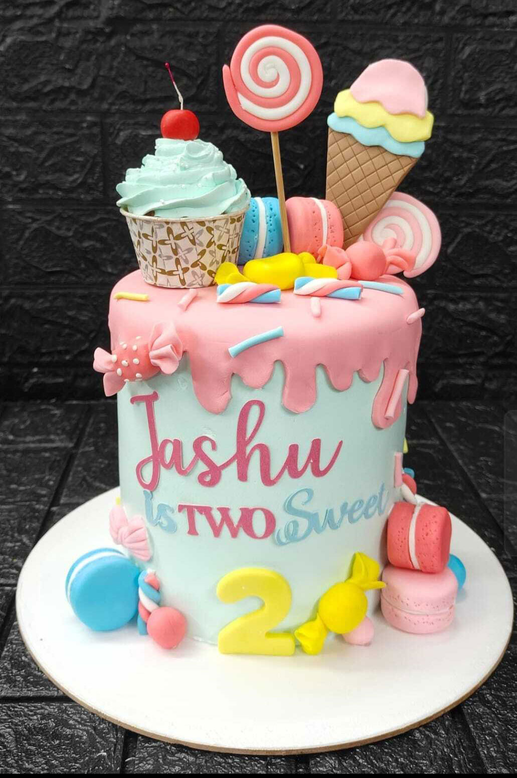 - Decorated with fondant ice cream cones, macarons, candies and lollipops