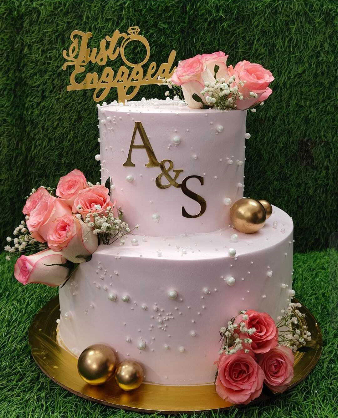 Celebrate your special moment with our Elegant Two Tier Engagement Cake with Pink Roses and Just Engaged Topper. This beautifully designed cake features two smooth tiers decorated with delicate pearl accents, soft pink roses, and a stylish gold “Just Engaged” topper, making it a perfect centerpiece for engagement celebrations.