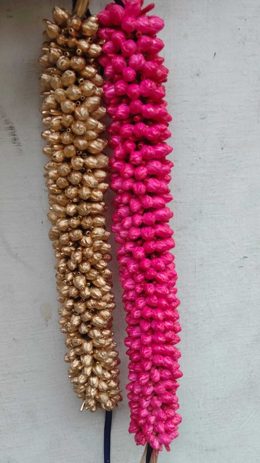 This beautiful arrangement features carefully crafted Nandhiya Vattam style flowers in vibrant pink and elegant gold shades, creating a stunning contrast that perfectly complements bridal sarees and traditional jewellery. The dense floral pattern gives a grand and luxurious appearance, making it ideal for brides who want a classic and royal look.