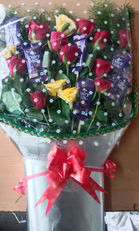 The combination of fresh roses, premium chocolates, and creative chart paper arrangement makes this bouquet a thoughtful and delightful gift for your loved ones.