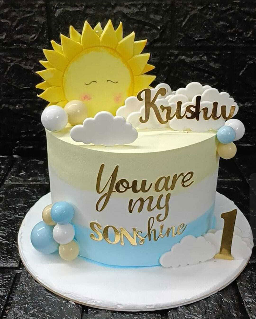 - Decorated with clouds, sun topper, and gold lettering